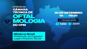 O Conselho Federal de Medicina (CFM) promoverá o II Fórum da Câmara Técnica de Oftalmologia do CFM. O evento tem como tema central: “Miopia no Brasil: Prevenção da Cegueira Legal e Impacto Social” e será realizado no dia 30 de setembro de 2025, das 9h às 14h30, no formato virtual, por meio da plataforma Zoom e transmissão ao vivo no canal do CFM no YouTube.