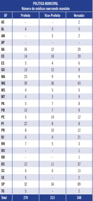 Nos municípios, 831 médicos brasileiros também têm participação ativa na política local. De acordo com dados do