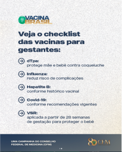 “Durante a gestação, a vacinação é uma aliada essencial. As vacinas recomendadas ajudam a proteger a mãe e também oferecem anticorpos importantes para o bebê nos primeiros meses de vida. O CFM reforça que gestantes devem seguir o calendário vacinal indicado pelas equipes de saúde, garantindo prevenção contra doenças que podem trazer riscos durante a gravidez”, reforça o CFM nas redes sociais.
