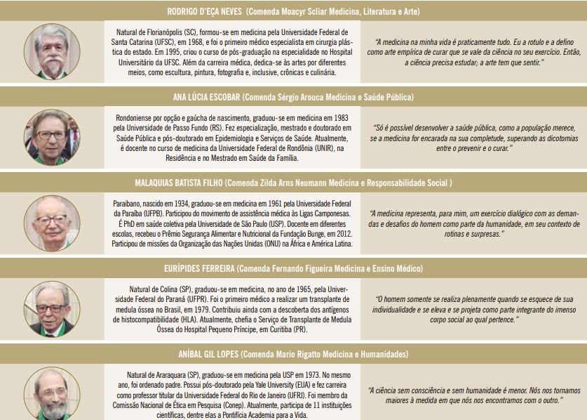 Os escolhidos para receber as Comendas CFM 2018 foram os médicos Eurípides Ferreira, Aníbal Gil Lopes, Rodrigo d’Eça Neves, Ana Lúcia Escobar e Malaquias Batista Filho. Eles se destacaram no engrandecimento da medicina – nacional e internacionalmente –, com trajetórias que tiveram maior vínculo nas áreas de Ensino Médico; Humanidades; Literatura e Arte; Saúde Pública; e Responsabilidade Social, respectivamente. Conheça a seguir um pouco sobre a trajetória e o pensamento de cada um dos novos comendadores.