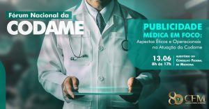 O Conselho Federal de Medicina (CFM) realizará, no dia 13 de junho de 2025, o Fórum Nacional da Codame, um encontro presencial que reunirá representantes do sistema conselhal para discutir aspectos éticos, operacionais e normativos da publicidade médica. O evento ocorrerá das 8h00 às 17h00, no auditório da sede do CFM, em Brasília, e é uma iniciativa coordenada pelo conselheiro federal Jeancarlo Fernandes Cavalcante, 3º vice-presidente do CFM e responsável pela Coordenação de Fiscalização e pela Comissão de Divulgação de Assuntos Médicos (Codame) do Conselho.