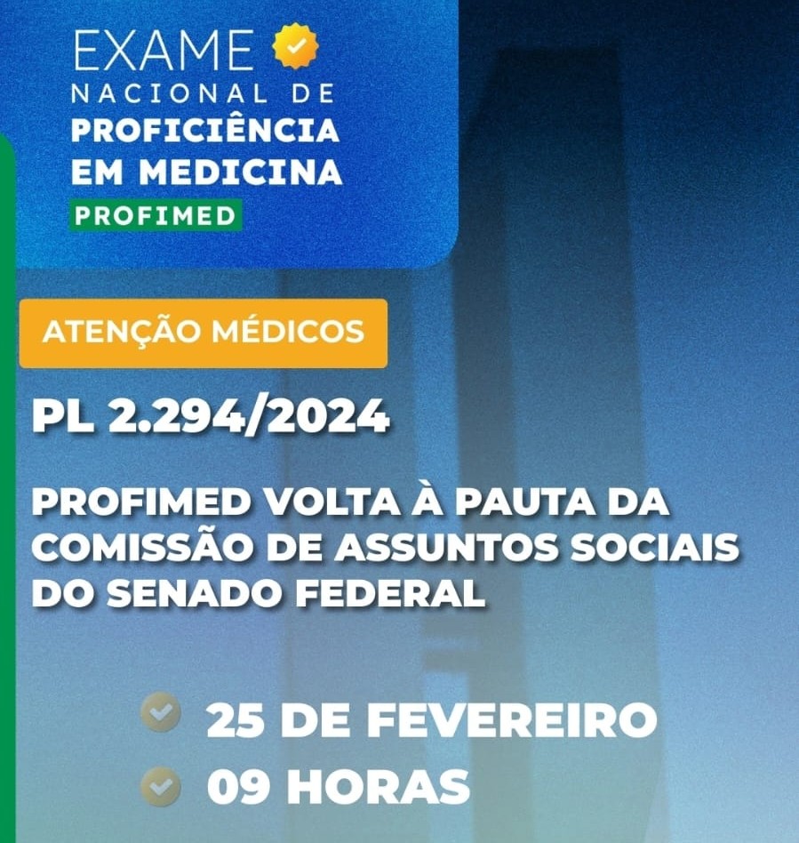 O Projeto de Lei (PL) nº 2.294/2024, que institui o Exame Nacional de Proficiência em Medicina (ProfiMed) e foi aprovado na Comissão de Assuntos Sociais (CAS) do Senado Federal em dezembro do ano passado, volta à pauta do colegiado nesta quarta-feira (25), às 9h. O Substitutivo apresentado foi aprovado com 11 votos favoráveis e 9 contrários, mas, como, a princípio, a proposta não vai ao Plenário do Senado, abriu-se prazo de emendamento em turno suplementar. Agora apenas o parecer proferido sobre essas emendas será deliberado.
