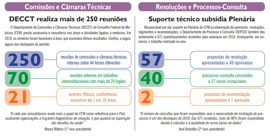 Aos 62 anos, o Conselho Federal de Medicina (CFM) goza de alto conceito na sociedade, que o reconhece como instituição legítima e representativa dos interesses da população médica no Brasil. Mais do que isso, a autarquia, composta ainda pelos 27 Conselhos Regionais (CRMs), se tornou referência na defesa da ética; no estímulo ao conhecimento e à competência técnica; e no esforço para qualifi car a assistência em todas as esferas (públicas e privadas). Para atingir tantos objetivos, o CFM conta com uma estrutura operacional baseada em Brasília (DF) que trabalha em sintonia com seu Plenário. Juntos, os conselheiros e a equipe de colaboradores têm conseguido agregar modernidade, transparência e efetividade às ações da instituição, fortalecendo-a ainda mais ao longo dos anos. Em 2018, não foi diferente. A conquista de importantes resultados marcou o período que, coincidentemente, também foi o palco de profundas mudanças políticas no País. Convidamos o leitor a conhecer um pouco das iniciativas do Conselho, o que o ajudará a compreender a importância do papel da entidade.