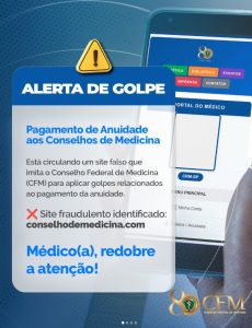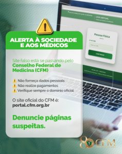 Outro golpe – Na última quinta-feira (19), o CFM também alertou sobre a existência de um site falso que utiliza indevidamente o nome da autarquia para simular comunicação oficial. A página fraudulenta pode solicitar dados pessoais, informações profissionais ou pagamentos indevidos. Na ocasião, o CFM reforçou que seu único endereço eletrônico oficial é: