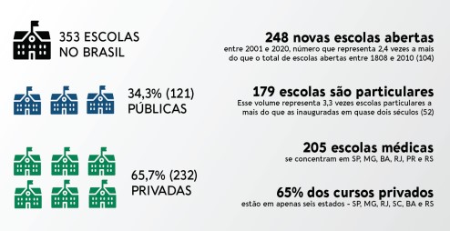 Até a década de 1980, o número de faculdades públicas de medicina era maior do que o de escolas privadas. Em 2000, houve empate, com 52 instituições de cada lado. A partir de então, houve um boom de escolas privadas, acelerado a partir de 2011. Cinquenta escolas privadas foram abertas de 2001 a 2010, e 116 de 2011 a 2019, totalizando 210 escolas privadas criadas nas duas décadas, contra apenas 67 faculdades públicas. Hoje, o Brasil tem 121 escolas médicas públicas, que respondem por 26% das vagas, e 232 privadas, responsáveis por 74% das matrículas. No total, são oferecidas 37.423 vagas anuais nos cursos de medicina.
