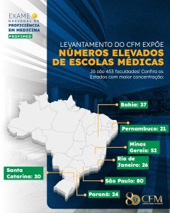 Em 2024, outro levantamento da autarquia revelou que 78% dos municípios que sediam escolas médicas não possuem infraestrutura mínima necessária para oferecer formação adequada, como números insuficientes de leitos de internação, de equipes da Estratégia Saúde da Família (ESF) e de hospitais de ensino. Diante desse quadro, o CFM e outras entidades médicas defendem a aprovação, no Congresso Nacional, do projeto de lei que cria o Exame Nacional de Proficiência em Medicina (ProfiMed).