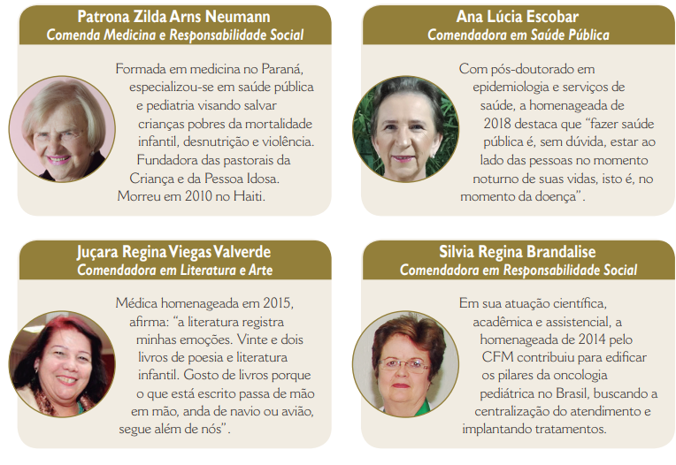 Ciente da importância da população feminina na medicina, desde 2011 o CFM prestigia médicos brasileiros que se destacam em diversas áreas com a entrega de comendas. Conheça a seguir as mulheres já agraciadas com a honraria.