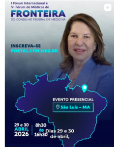 O Conselho Federal de Medicina (CFM) realizará, nos dias 29 e 30 de abril de 2026, em São Luís (MA), o I Fórum Internacional de Médicos de Fronteira e o VI Fórum de Médicos de Fronteira do CFM. O encontro acontecerá das 8h às 17h e reunirá especialistas, autoridades sanitárias, representantes de organismos internacionais e profissionais que atuam em regiões limítrofes para discutir os desafios da assistência médica nessas áreas. A programação completa pode ser conhecida na página do evento no Portal Médico. ACESSE AQUI.