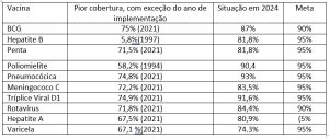 Veja, abaixo, como está o índice de cobertura das principais vacinas que fazem parte do PNI (dados de 2024).